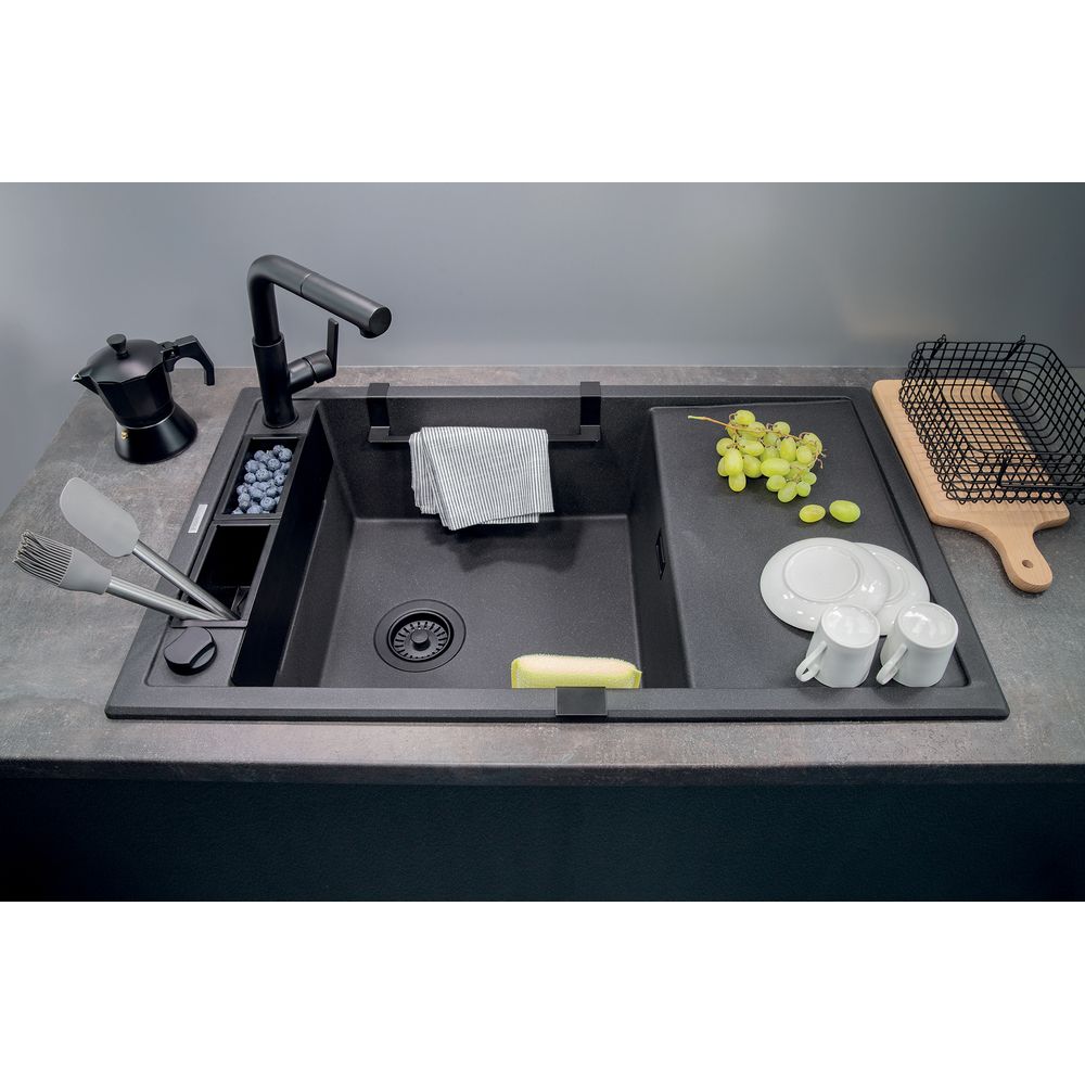 A modern sink with magnetic properties, thanks to which a steel cover can be placed on the side of the bowl, separating the bowl from the side shelf, creating additional space that increases the functionality of the sink. The sink can be equipped with dedicated accessories from the Magnetic collection - kitchen cloth and sponge holders or practical baskets with a drainer.