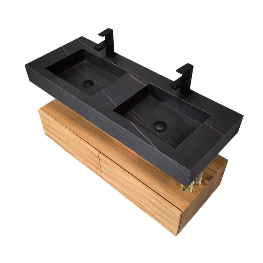 Bring a touch of elegance to your bathroom with this sintered stone basin paired with an oak cabinet featuring a water wave textured drawer panel. The sintered stone basin is known for its durability and sleek finish, offering both style and functionality. The oak cabinet provides warmth and natural charm, while the water wave texture on the drawer panel adds a unique and eye-catching design. With ample storage and a soft-close feature, this piece is the perfect blend of luxury and practicality, making it a standout in any modern bathroom.